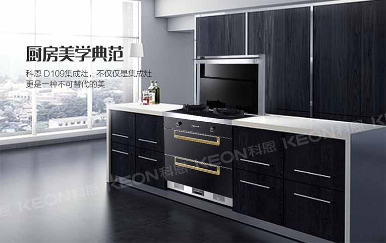 灶藝不凡,集成灶十大品牌、廚電行業十大品牌科恩集成灶只為締造安全舒適的健康廚房,科恩D109消毒柜款集成灶,不僅僅是集成灶,更是一種不可替代的美,90°T型機頭設計,攏煙效果更出色,可拆卸科恩達網板,黑晶防爆玻璃雙層疊加式冷凝壁,冷凝油煙效果更佳,下置油煙過濾網板,99.9%油煙分離率,經過特氟龍涂層工藝,更加經久耐用!科恩D109集成灶強大的功能,為您締造一個靜雅的廚房環境,靜謐無油煙,讓您輕松心情的同時,充分享受烹飪帶來的樂趣。
