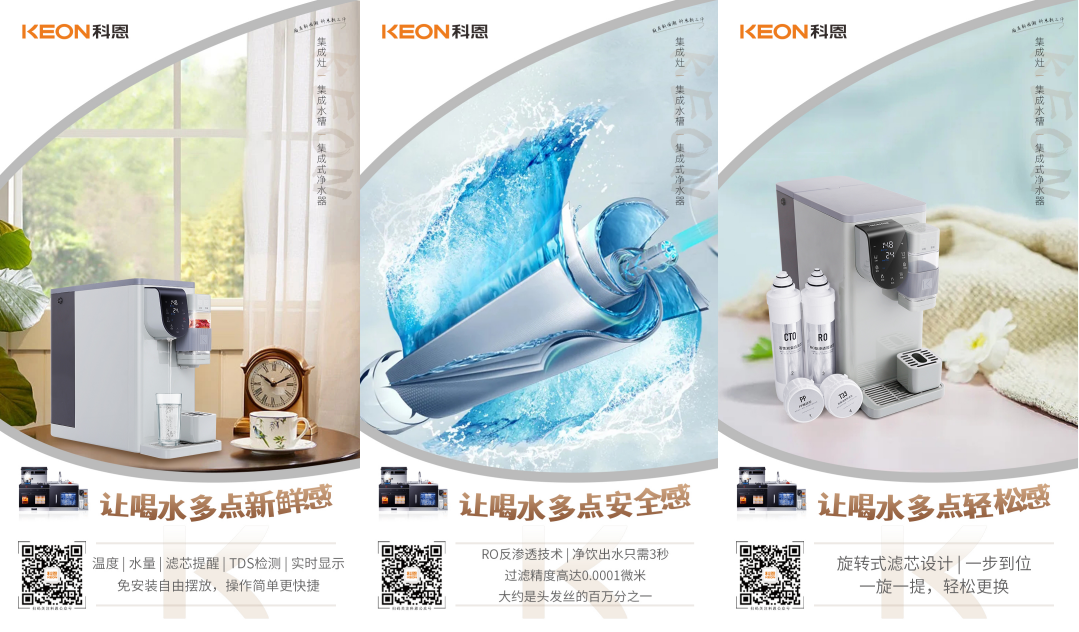 清晨早起的第一杯水,承載著一天的愉悅和舒心,科恩R6068集成式凈水器,精準控溫出水,無需在旁等待,定量自動取水,不溢杯不浪費,用一杯甘甜好水喚醒全身細胞,激活新陳代謝,元氣滿滿。科恩R6068免安裝自由擺放,客廳、廚房、臥室、書房,到哪都可以喝上放心水,溫度、水量、濾芯壽命實時顯示,水質監測,一目了然。RO反滲透技術,凈飲出水只需3秒,過濾精度高達0.0001微米,大約是頭發絲的百萬分之一,鮮活凈飲,凈在咫尺;旋轉式濾芯設計,一步到位,一旋一提,輕松更換,安全感滿滿,幸福感爆棚!