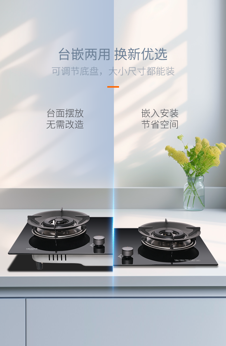 小灶大能,換裝無(wú)憂。自適應(yīng)底盤(pán),換灶零門檻。不擴(kuò)孔不改孔,老廚房無(wú)縫升級(jí)。臺(tái)嵌兩用,換新優(yōu)選,意外熄火秒斷氣源,一級(jí)能效認(rèn)證,環(huán)保省錢雙贏,舊灶退役,新灶即刻上崗。黑晶美學(xué),格調(diào)新生。黑晶防爆鋼化玻璃面板,一抹即凈的優(yōu)雅,廚房秒變秀場(chǎng)。蜂巢矩陣不銹鋼湯盤(pán),頑固污漬克星,全新筑巢方式點(diǎn)線嵌入,污漬無(wú)處遁形,清潔更輕松。