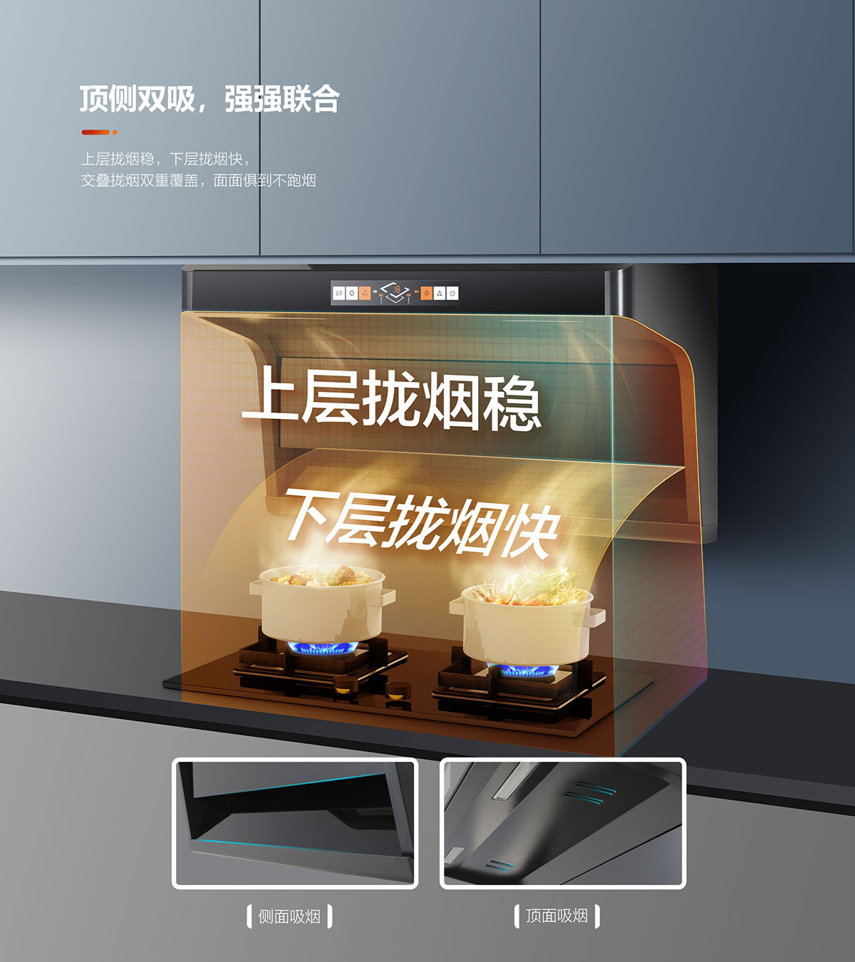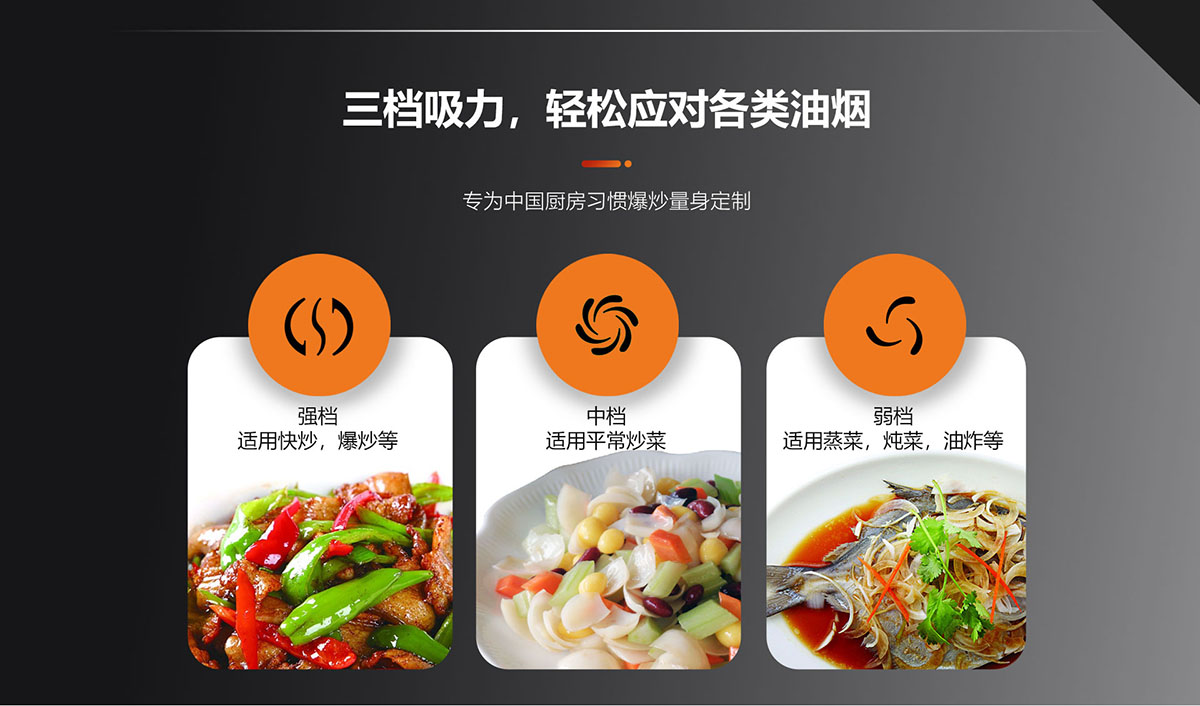 三檔吸力,輕松應對各類油煙,專為中國廚房習慣爆炒量身定制