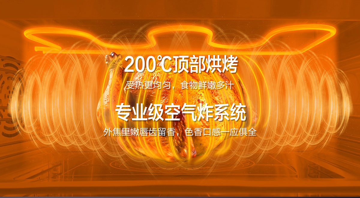 - 200℃頂部烘烤,受熱更均勻,食物鮮嫩多汁